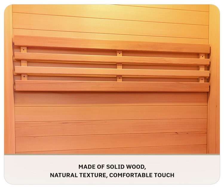 Dua kayu premium Kanada, Hemlock dan Red Cedar, dipilih. Kayunya keras dan tahan lama, dengan tekstur alami bening dan warna elegan seragam. Sifat alami dari setiap potongan kayu memberi sauna tekstur yang unik, menyuntikkan gen estetika alami dan kelas atas ke dalam ruang kesehatan rumah Anda.sauna inframerah dalam ruangan untuk rumah.