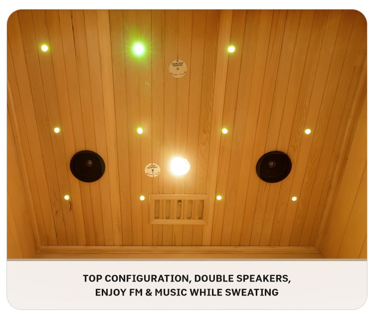 Sistem dual-speaker dikonfigurasi di bagian atas, mendukung radio FM dan pemutaran musik. Anda dapat menikmati melodi atau program radio favorit sambil berkeringat, meningkatkan pengalaman sauna yang mendalam.