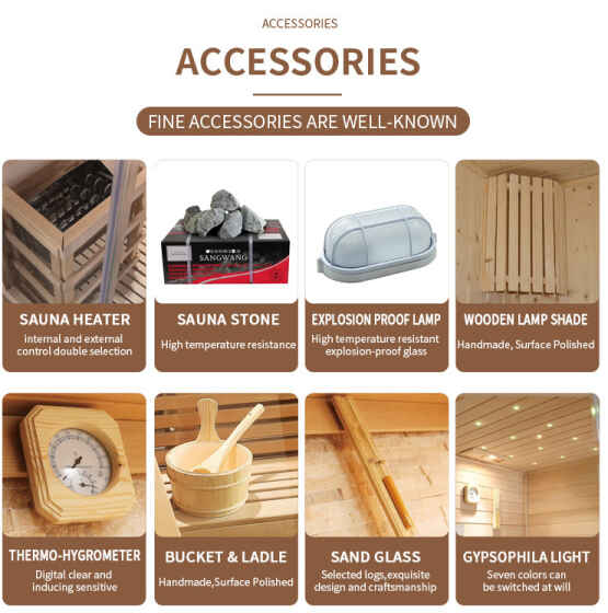 ItuPintu kaca luar ruangan ruang uap luar ruangandilengkapi dengan 8 kategori aksesori inti, yang mencakup seluruh kebutuhan proses sauna, menunjukkan kualitas secara detail: