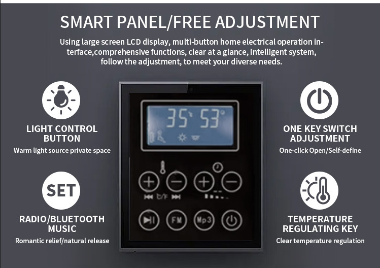 ItuPintu kaca luar ruangan ruang uap luar ruangandilengkapi dengan panel kontrol cerdas LCD berukuran besar khusus luar ruangan (desain tahan air dan tahan debu), mewujudkan pengoperasian yang mudah "kontrol satu tombol":