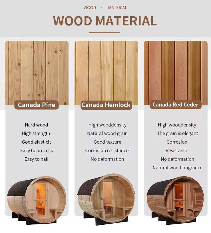Keahlian yang Matang: ItuPintu kaca luar ruangan ruang uap luar ruanganmengadopsi peralatan pertukangan kayu profesional (seperti mesin pengamplasan) yang dikombinasikan dengan proses khusus di luar ruangan. Kayu diperlakukan dengan anti-korosi dan tahan lembab, dengan penyambungan yang rapat dan perawatan kedap air yang disegel, permukaan halus tanpa gerinda, beradaptasi dengan lingkungan luar ruangan yang hujan, bersalju, dan lembab.